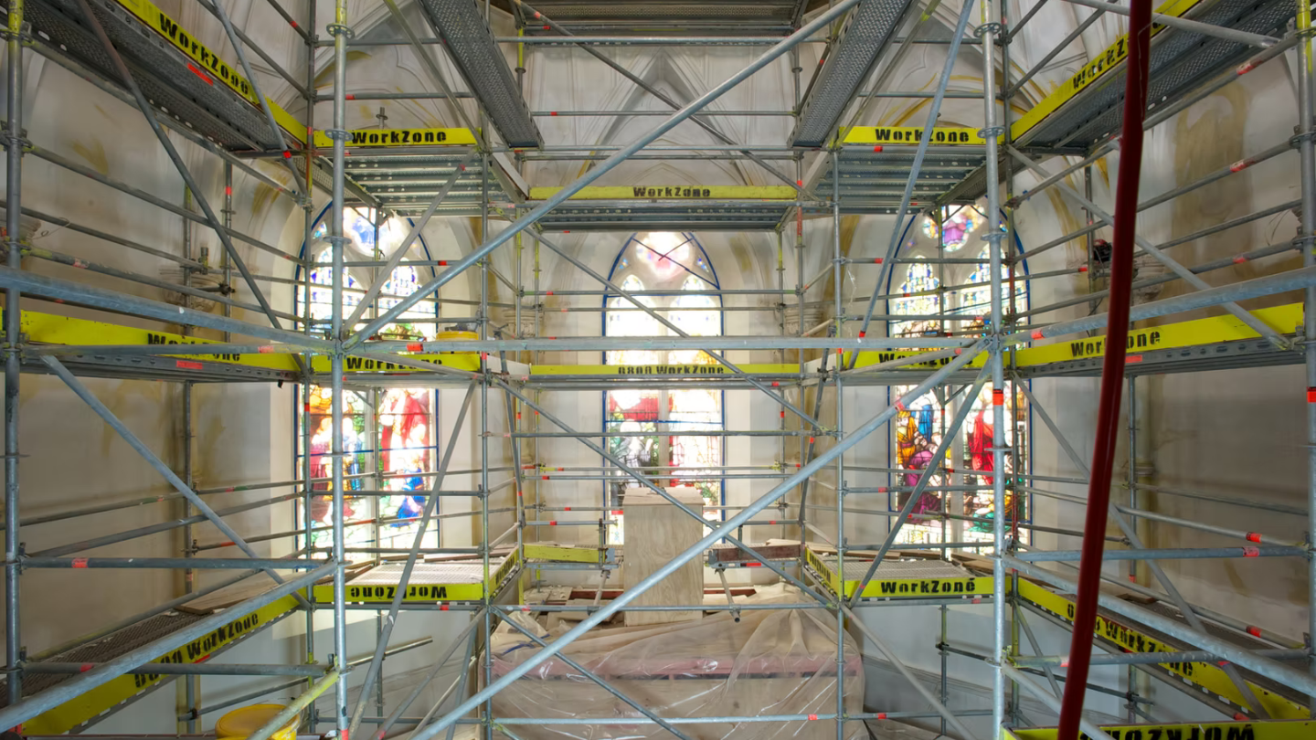 “We were asked to provide a working platform that reached every side and detailed area of the chapel’s interior,” said Kurt Simpson of WorkZone Scaffolds. “Using Layher’s modular system, we could adapt the bay sizes precisely to fit the space, with bridging transoms enabling full decking coverage.”